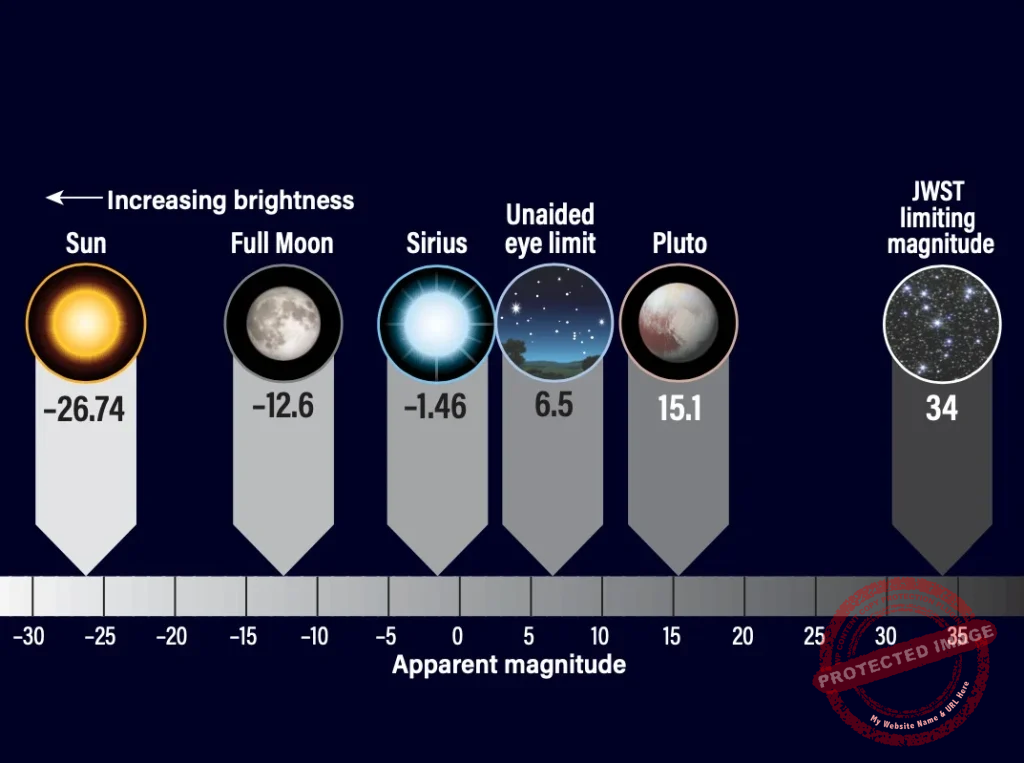 එම වර්ගීකරණයට අනුව සූර්යයාගේ දීප්තියයේ විශාලත්වයේ අගය ඒකක -27ක්. මෙම ලැයිස්තුවට අනුව ඉතා දීප්තිමත් වස්තූන් ගේ දීප්තියේ විශාලත්වය මැග්නිටියුඩ් ඒකක ඉතා කුඩා අගයක් ගන්නා අතර දීප්තිය අඩු නැත්නම් අඳුරු වස්තූන්ගේ දීප්තියේ විශාලත්වය මැග්නිටියුඩ් ඒකක විශාල ප්රමාණයක් දක්වා දිව යනවා.